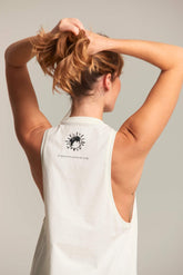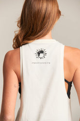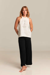 El mensaje que acompaña a esta camiseta sin tirantes, “Lokah samastah sukhino bhavantu”, significa que todos los seres de la tierra sean felices y libres de sufrimiento.